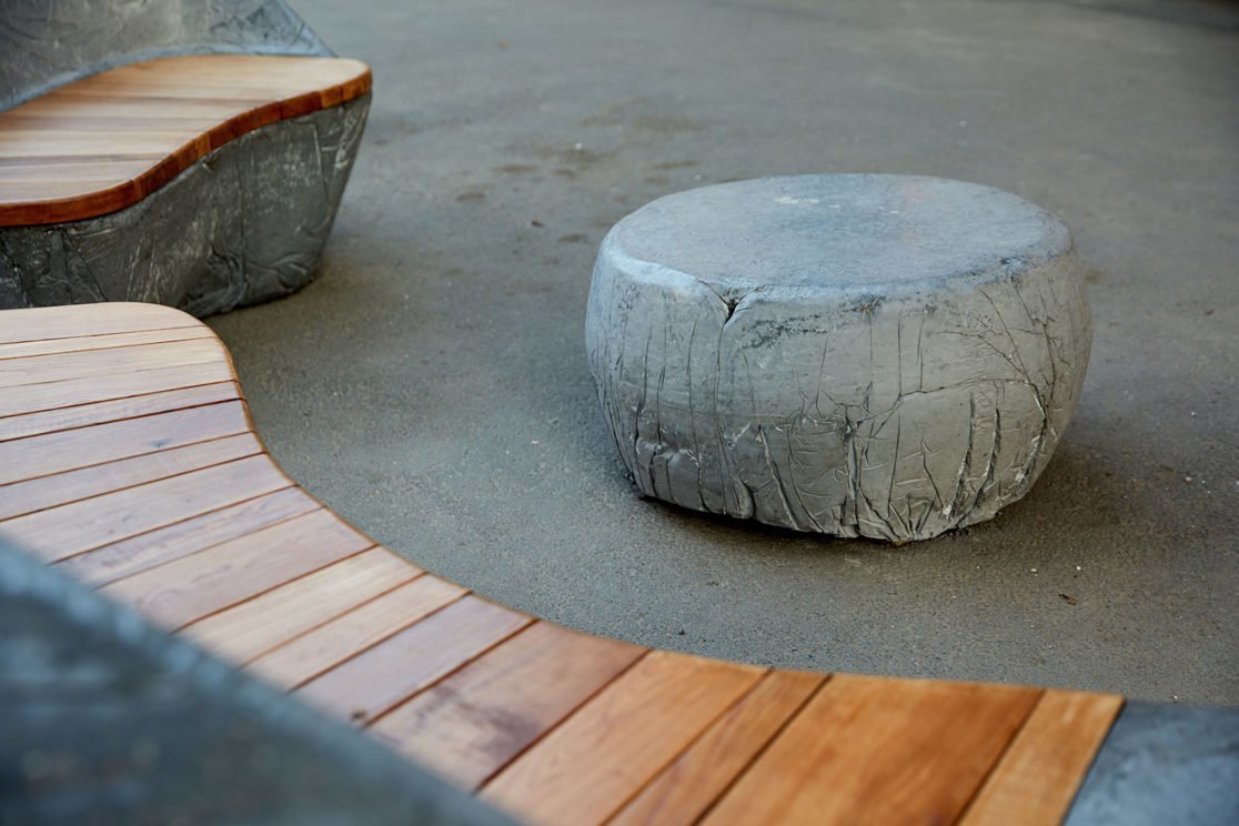 Concepția are ca miză experiența senzorială și pornește de la dorința de a realiza forme plastice din beton cu suprafața ideal netedă, obținute prin turnarea în matriță izolată cu polietilenă. Un efect pe cât de simplu pe atât de plin de surprize și care asigură acea senzație de suprafață catifelată. Procesul a însemnat un lung drum de manoperă, un drum care după etapa de proiectare a ricoșat puternic în zona sculpturii și a tehnicilor acestui domeniu. Betonul servește ca element plastic portant al mobilierului, iar suprafața de șezut este realizată din lemn masiv.